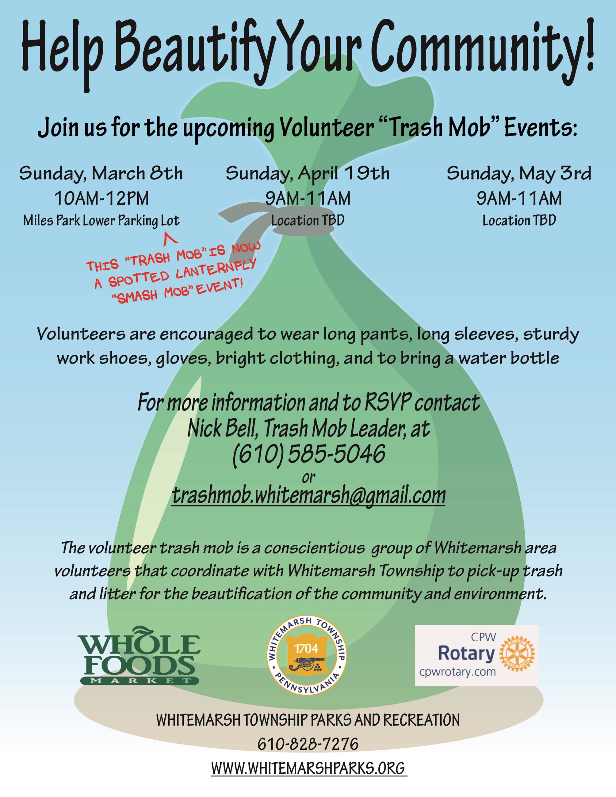 Join us for the upcoming Volunteer "Trash Mob" Event! The volunteer trash mob is a conscientious group of Whitemarsh area volunteers that collect trash and litter for the beautification of our community and environment!