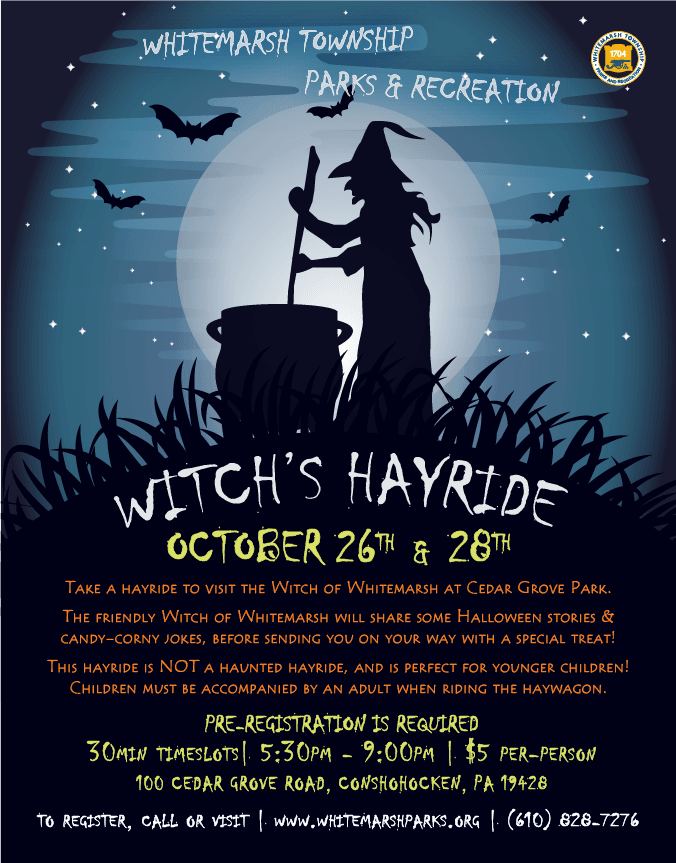Take a Hayride to visit the Witch of Whitemarsh at Cedar Grove Park. The friendly Witch of Whitemarsh will share some Halloween stories & candy-corny jokes, before sending you on your way with a special treat! This hayride is NOT a haunted hayride, and is perfect for younger children! Children must be accompanied by an adult when riding the haywagon. Register today on Community Pass or by calling the Parks and Recreation office at 610-828-7276!